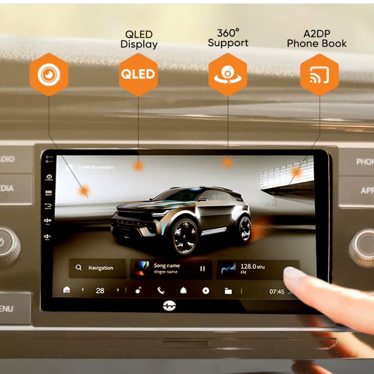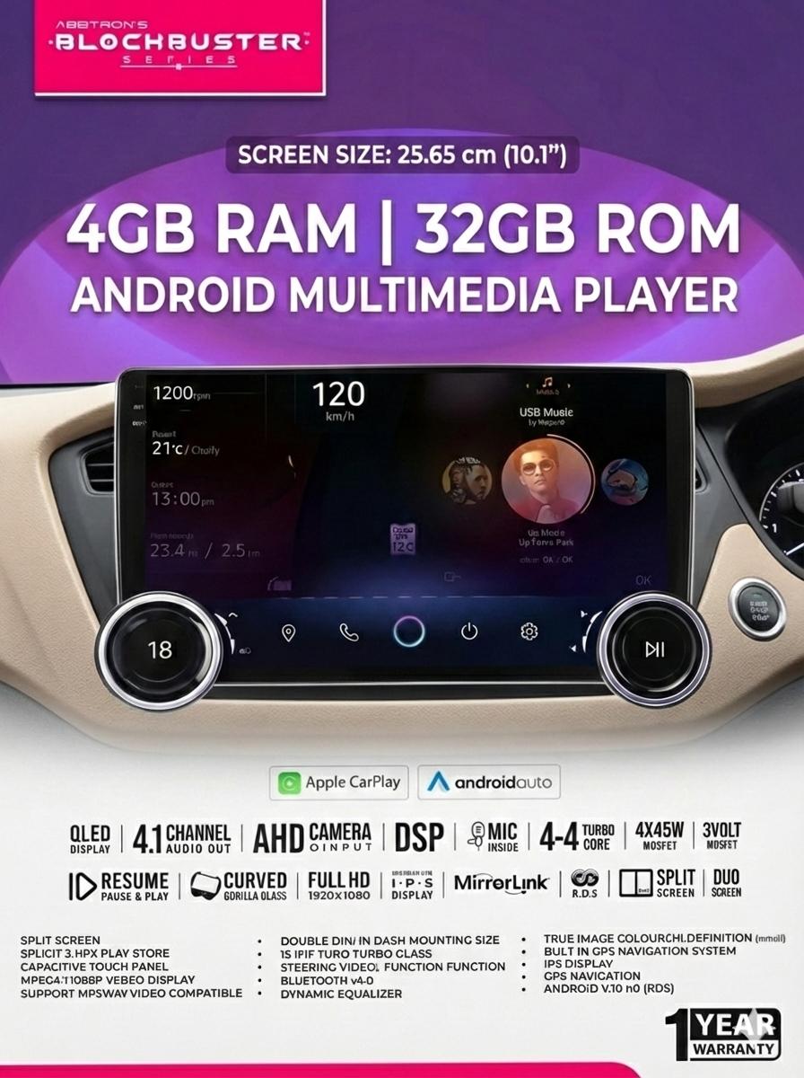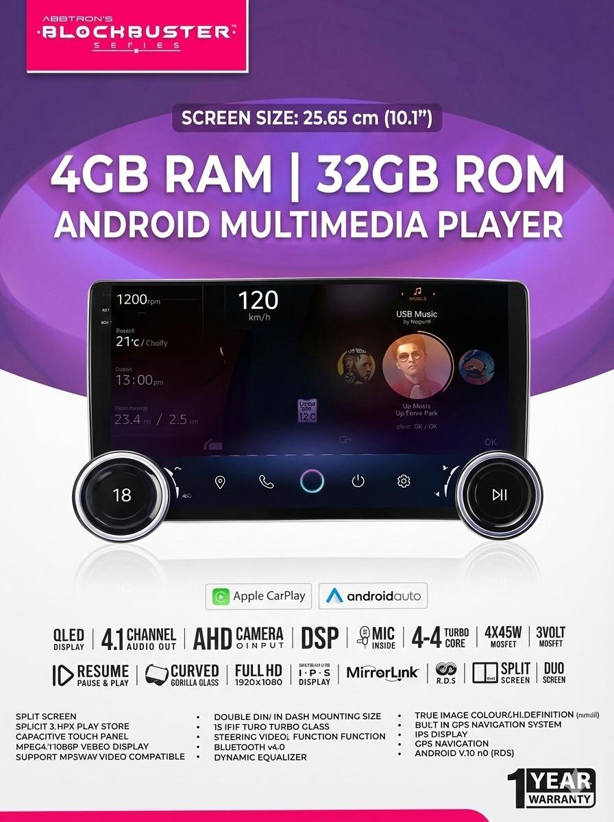9 Inches, android auto car play, Apple car play, MirrorLink, (wireless & wired) Built-in Bluetooth
